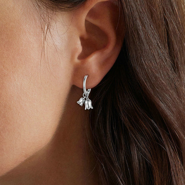 The earrings are a simple yet striking design, with a classic hoop that holds two delicate, dangling bellflower charms. They have a height of 20mm and a width of 10mm, with an inner earring diameter of 9mm. The coordinating necklace features a delicate chain and a single, bold bellflower pendant, sized at 30mm x 40mm. The chain length is 380mm with an additional 50mm extension. This set is perfect for women seeking a touch of natural sophistication.